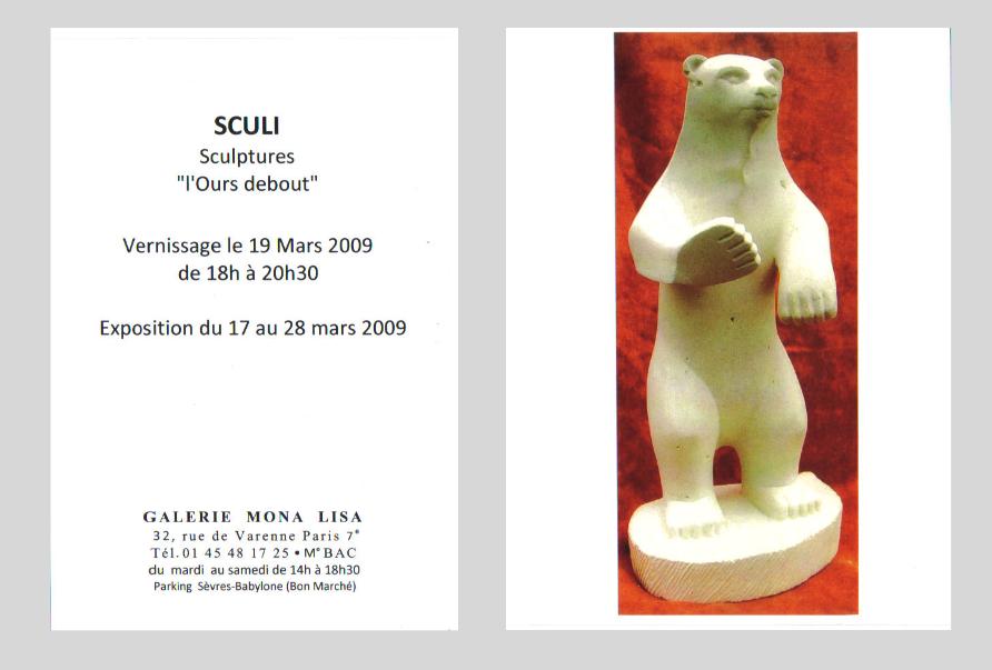 Exposition à la galerie MONA LISA, 32 rue de Varenne 75007 PARIS , Mardi 17 Mars 2009 au 28 Mars 2009 ; vernissage le jeudi 19 Mars de 18 h à 20 h 30. Liste des sculptures exposées.